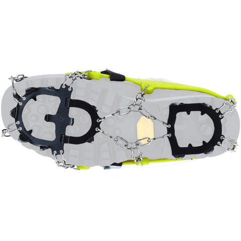 Crampons dedicated to improving mobility during trekking on easy icy mountains trails and their slippery sections. 15 mm long carbon steel spikes grip ice and packed snow easily. The highly flexible rubber part and the stainless steel chains fit most footwear perfectly while the adjustable velcro strap provides security and stability. Available in 4 sizes with zippered carry bag in the set.